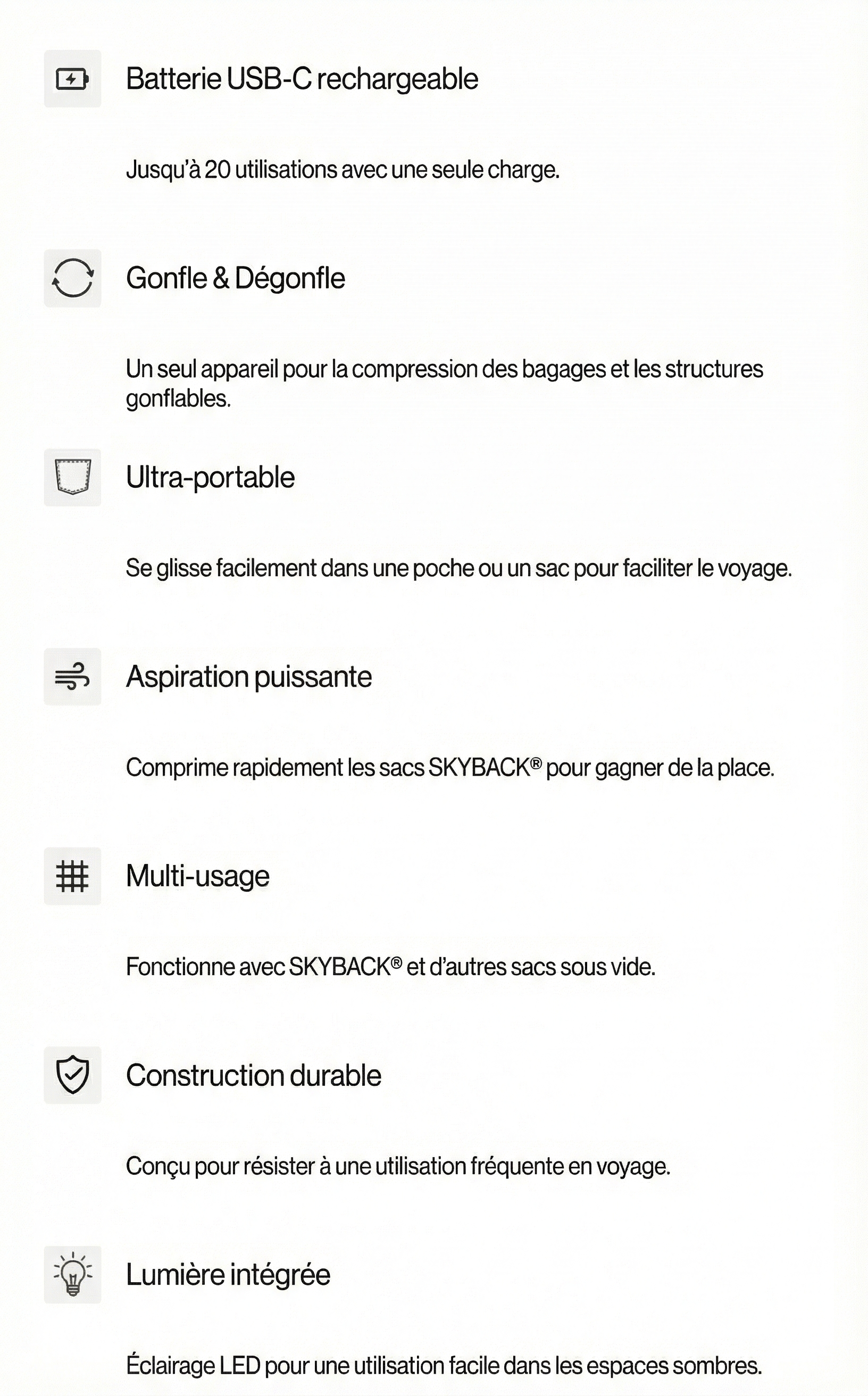 Pompe à air compacte et rechargeable conçue pour évacuer rapidement l'air de vos compartiments sous vide. Son design ultra-portable se glisse facilement dans votre sac ou votre poche, tandis que sa batterie longue durée garantit une utilisation fiable en voyage. Compatible avec tous les sacs et articles scellables sous vide, elle maximise votre espace de rangement avec une opération simple et intuitive. Construction robuste pour résister aux exigences du voyage quotidien.