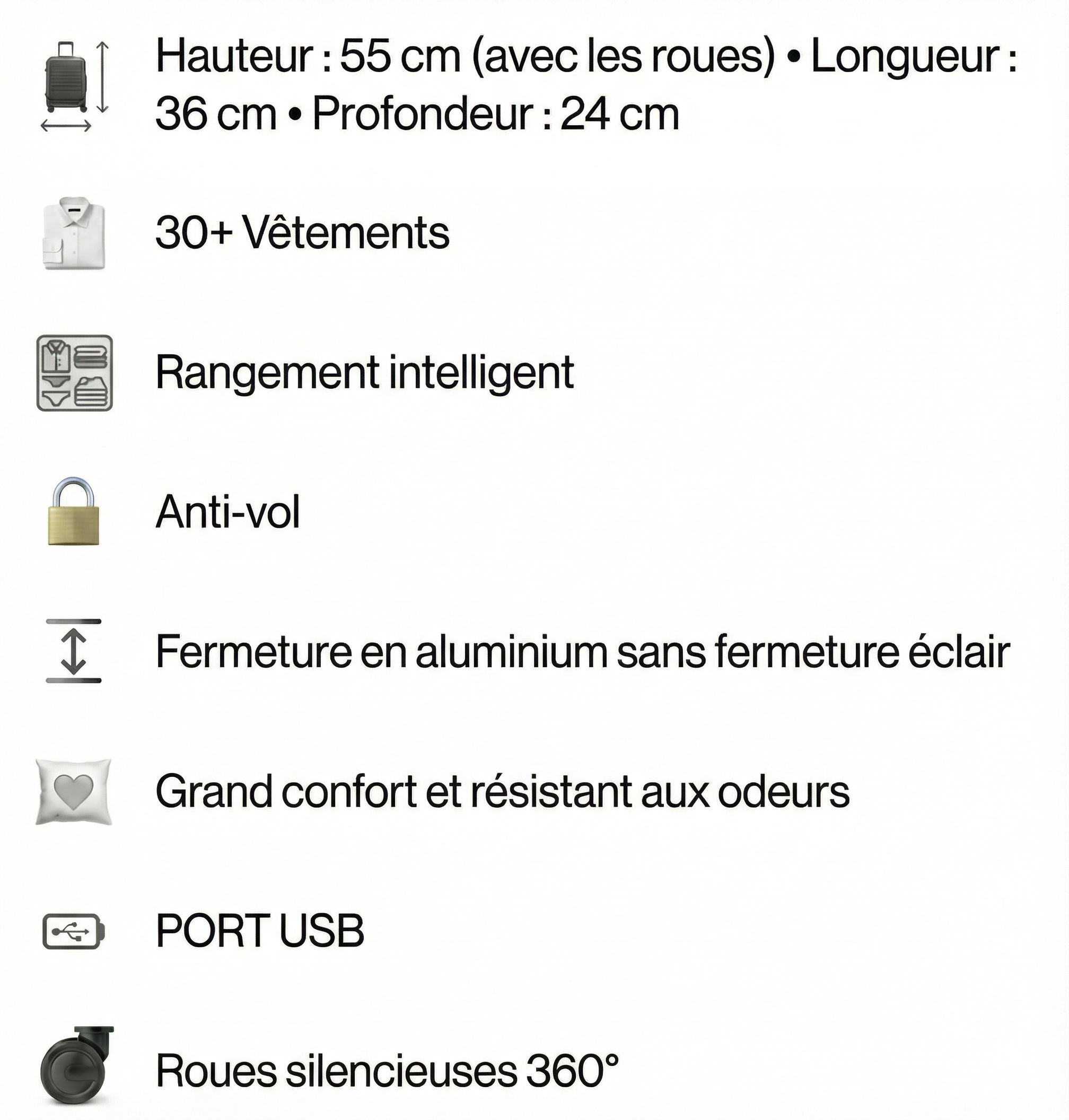 Valise cabine compacte conçue pour les voyageurs exigeants. Compartiment dédié pour ordinateur portable, prise USB intégrée pour recharger vos appareils en déplacement. Porte-sac à main pratique, support bouteille et support téléphone pour garder l'essentiel à portée de main. Roues 360° silencieuses pour une mobilité fluide dans les aéroports et gares. Dimensions conformes aux normes cabine, maximisant l'espace de rangement sans compromettre la maniabilité.